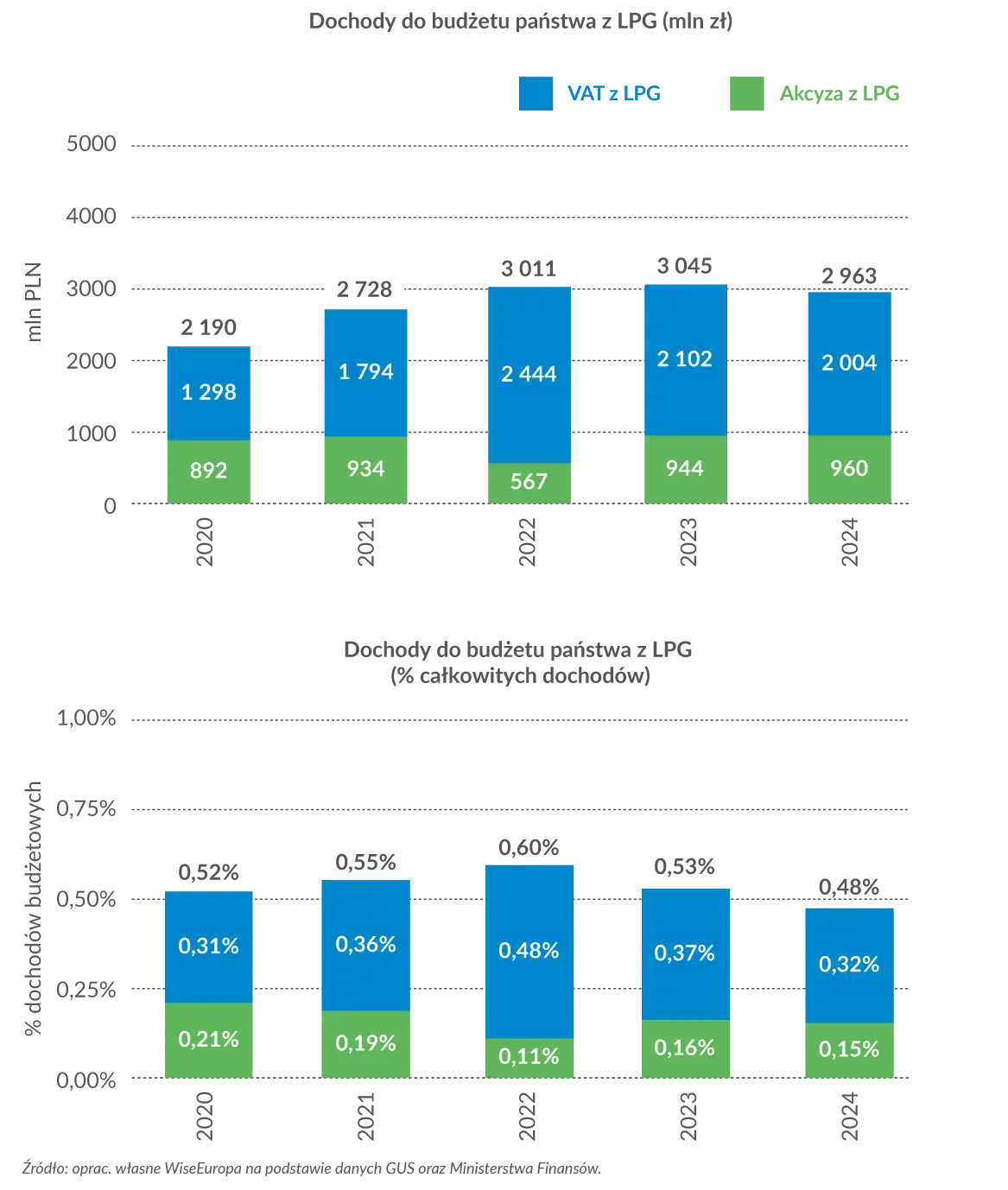 W lutym br. instytut WiseEuropa przeprowadził analizę wpływów podatkowych generowanych przez branżę LPG. Szczegóły można znaleźć w raporcie pt. Branża LPG: Rola i znaczenie w gospodarce Polski. Według WiseEuropa wpływy z podatku VAT od LPG wyniosły w 2024 r. 2 mld zł, a w 2022 r. pomimo obowiązywania obniżonej stawki VAT – przekroczyły 2,4 mld zł (0,48% całkowitych dochodów), osiągając rekordowy poziom. Było to efektem wyższej ceny LPG w skali roku. Podobna sytuacja ma miejsce w efekcie blokady Cieśniny Ormuz.